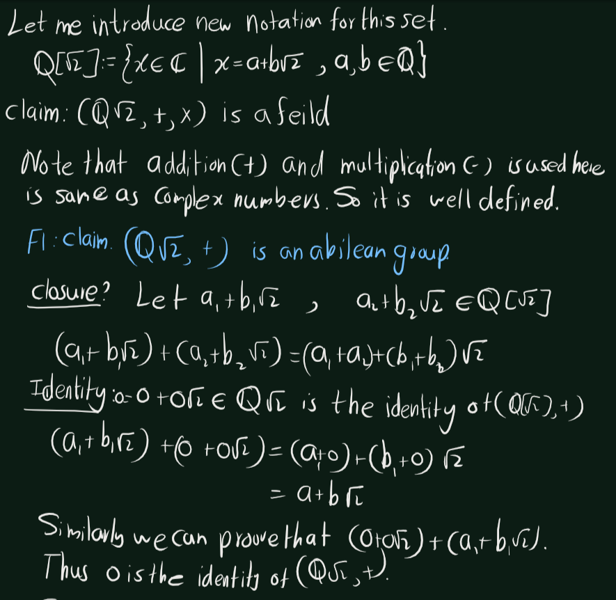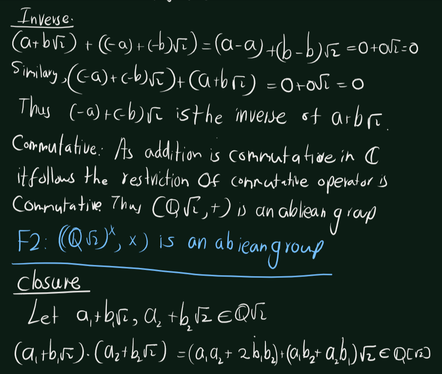 Exercise 5.1 (Artin 3.1.1) Prove that the numbers of the form \(a + b\sqrt(2)\),where a and b are rational numbers, form a subfield of \(\mathbb{C}\)