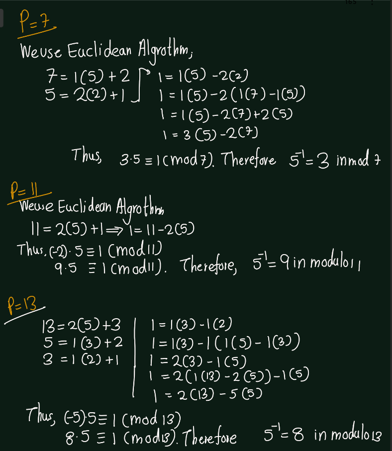 Exercise 5.2 (Artin 3.1.2) Find the inverse of \(5\) modulo \(p\), for \(p= 7, 11, 13,\) and \(17\).