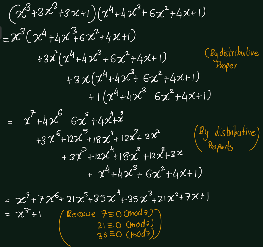 Exercise 5.3 (Artin 3.1.3) Compute the product polynomial \((x^3 + 3x^2 + 3x + 1)(x^4 + 4x^3 + 6x^2 + 4x + 1)\) when the coefficients are regarded as elements of the field \(\mathbb{F}_7\). Explain your answer.