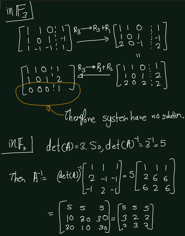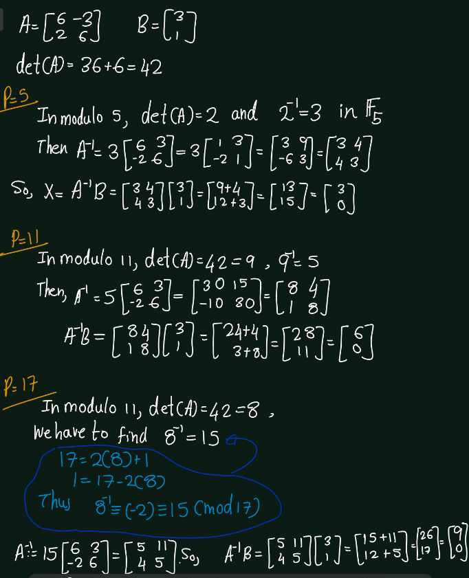 - Solve the system in \(\mathbb{F}_p\) when \(p = 5, 11,\) and \(17\).