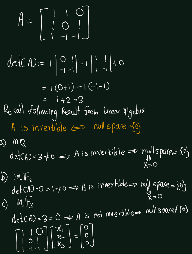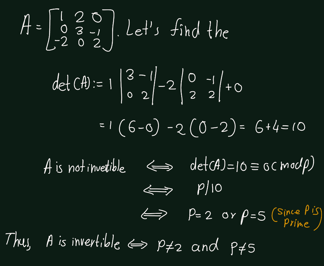 Exercise 5.5 (Artin 3.1.5) Determine the primes \(p\) such that the \[A =\begin{bmatrix} 1 & 2 & 0 \\ 0 & 3 & -1 \\ -2 & 0 & 2 \end{bmatrix}\] is invertible, when its entries are considered to be in \(\mathbb{F}_p\).