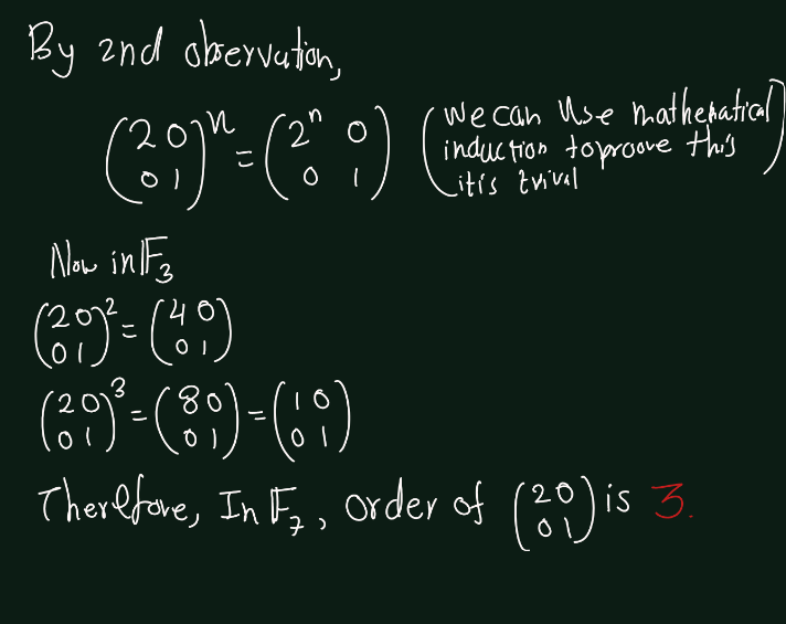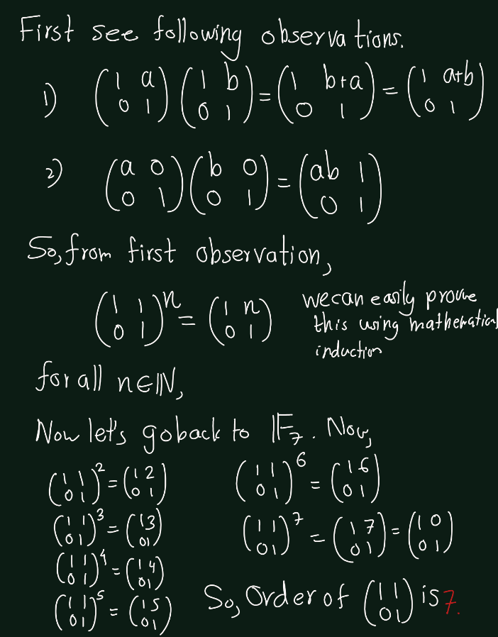 Exercise 5.9 (Artin 3.1.9) Determine the orders of the matrices \(\begin{bmatrix} 1 & 1 \\ 0 & 1 \end{bmatrix}\) and \(\begin{bmatrix} 2 & 0 \\ 0 & 1 \end{bmatrix}\) in the group \(GL_2(\mathbb{F}_7)\).