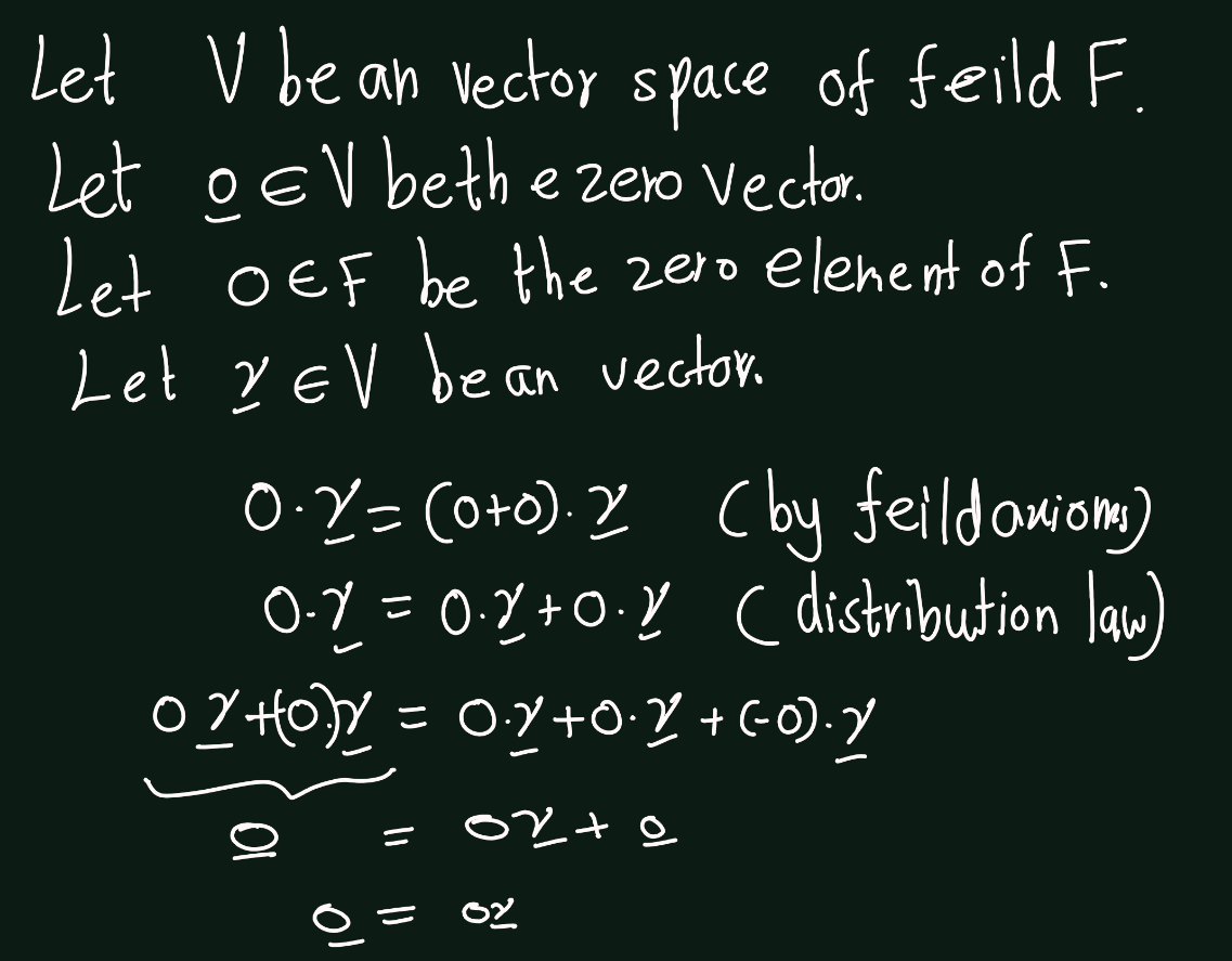- Prove that the scalar product of a vector with the zero element of the field \(F\) is the zero vector.
