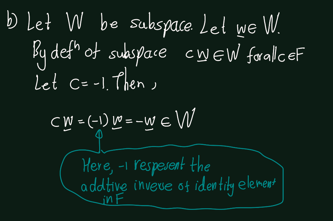 - Prove that if \(w\) is an element of a subspace \(W\), then \(-w\) is in \(W\) too.