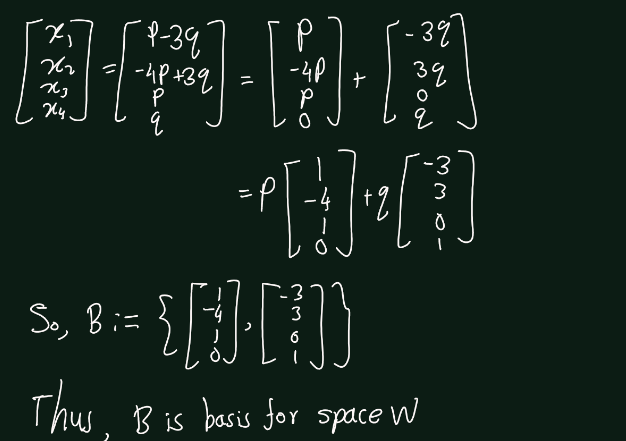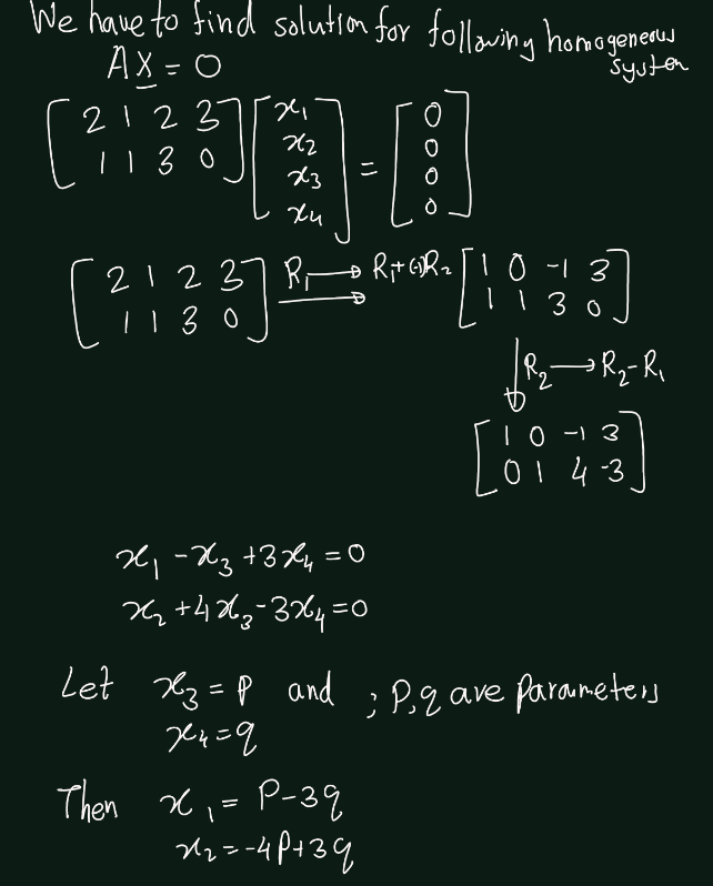 Exercise 5.15 (Artin 3.3.2) Let \(W \subset \mathbb{R}^4\) be the space of solutions of the system of linear equations \(AX = 0\), where \(A =\begin{bmatrix} 2 & 1 & 2 & 3 \\ 1 & 1 & 3 & 0 \end{bmatrix}\). Find a basis for \(W\).
