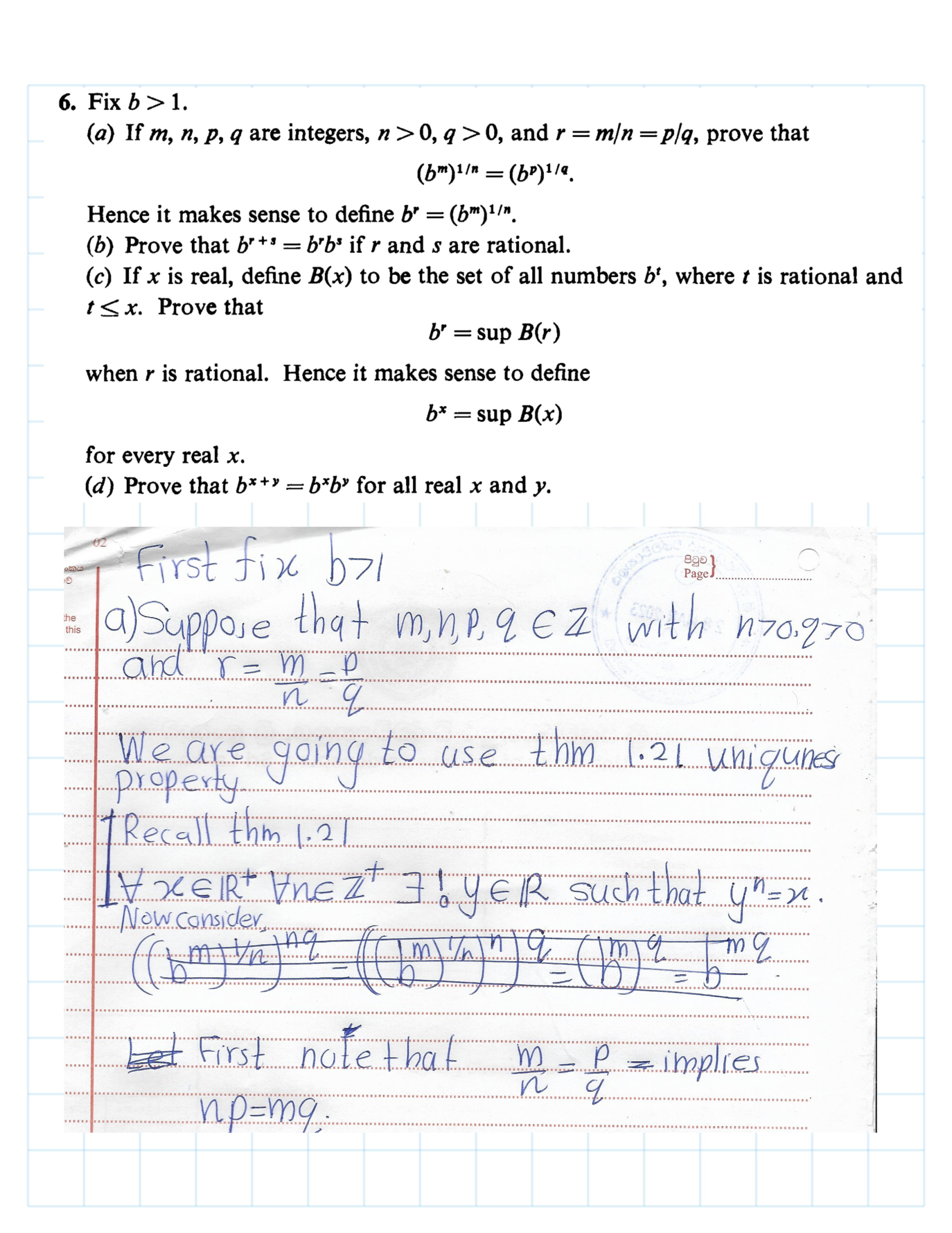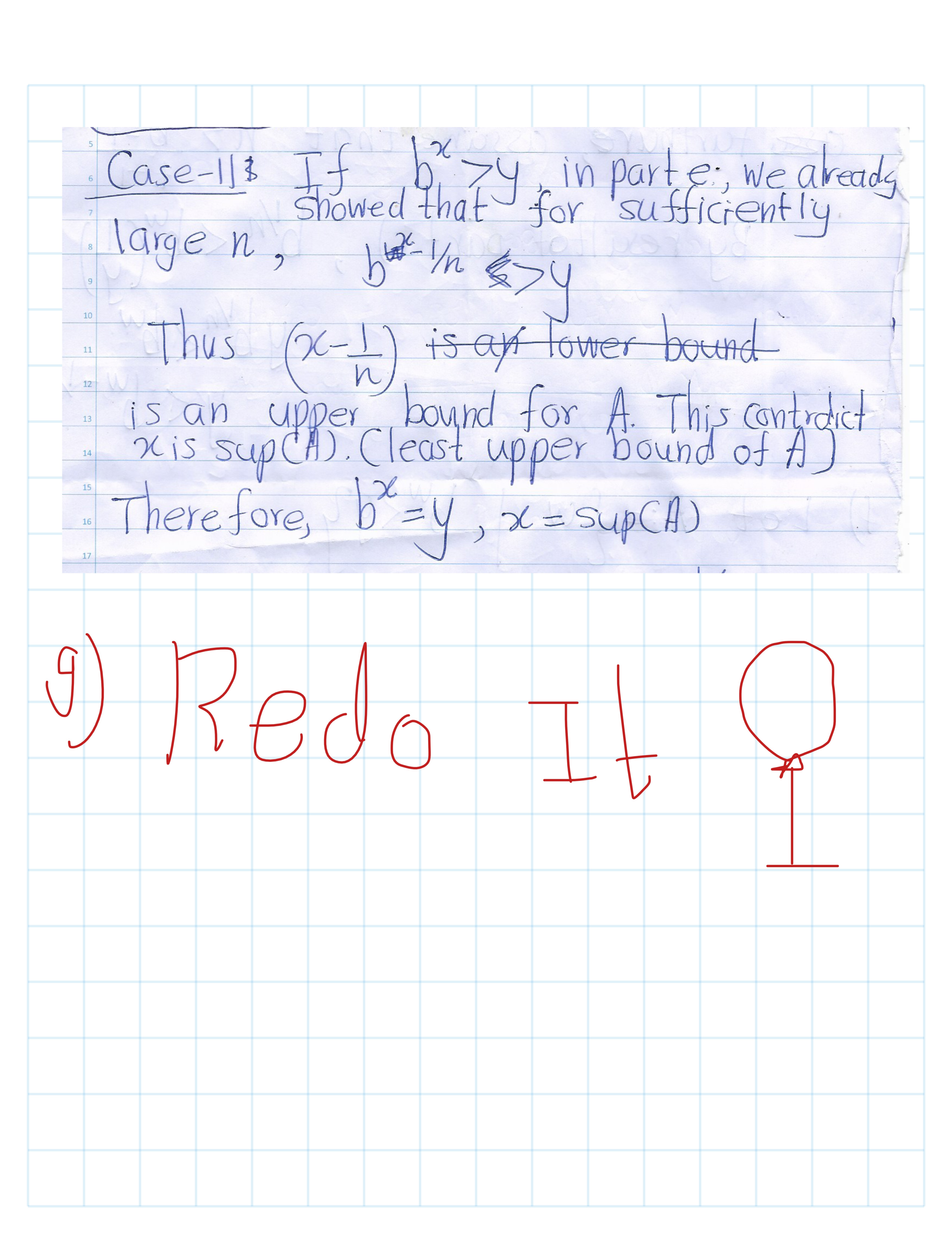 Assume the contray that \(rx\in \mathbb{Q}\). Since, \(\mathbb{Q}\) is field, \[\left(\frac{1}{x}\right)rx=\left(\frac{1}{x}\right)xr=\left(\frac{1}{x}x\right)r=x\in \mathbb{Q}\]. This is a contradiction. Thus, \(rx\) is irrational.