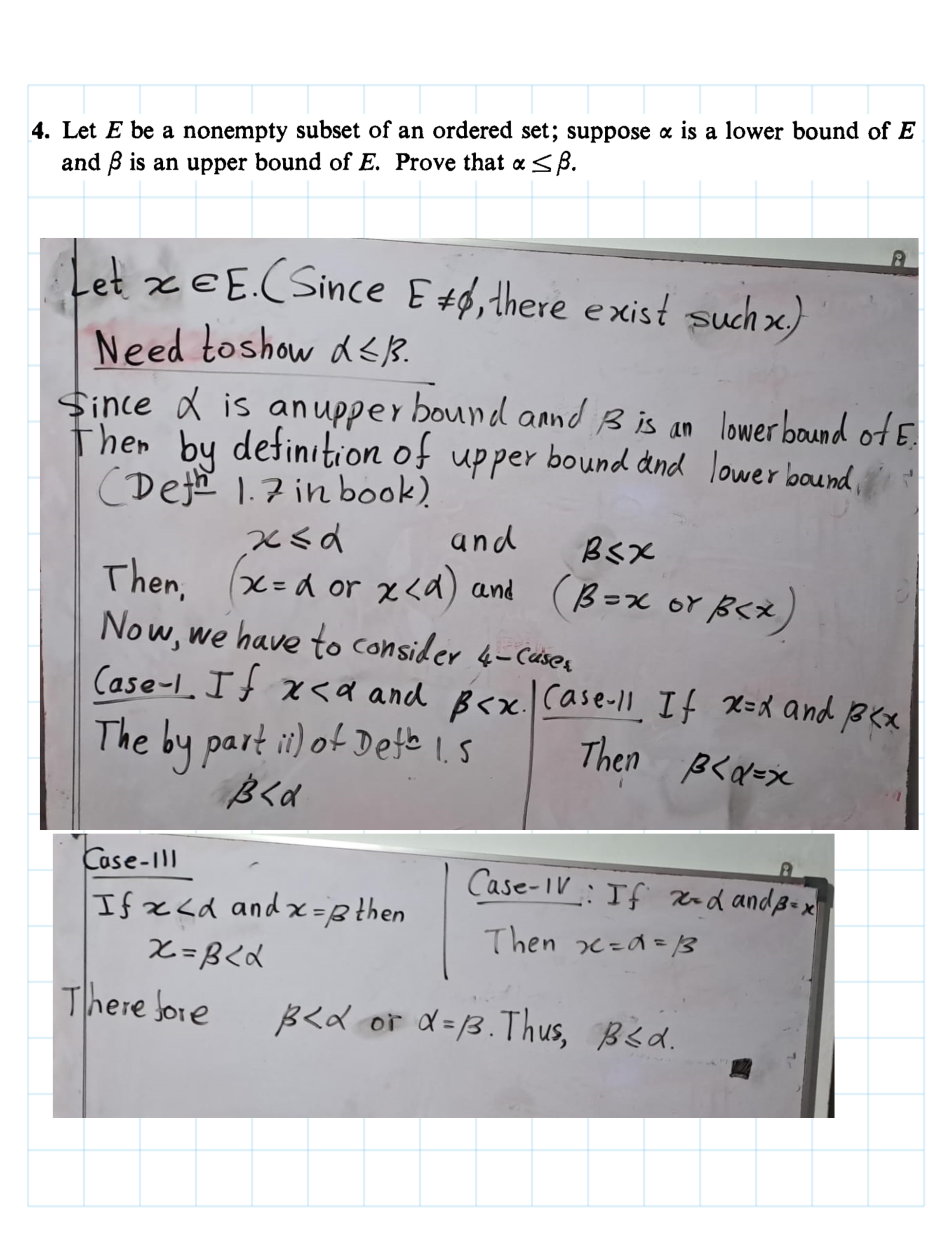 Exercise 1.4 Let \(E\) be a nonempty subset of an ordered set. Suppose \(\alpha\) is a lower bound of \(E\) and \(\beta\) is an upper bound of \(E\). Prove that \(\alpha \leq \beta\).
