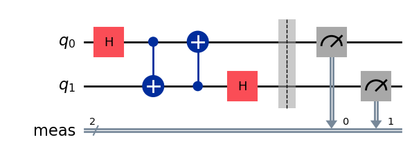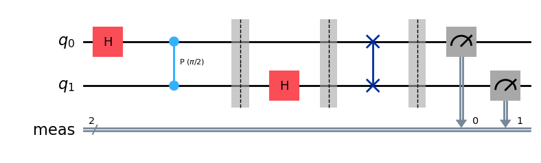 ┌───┐ ░ ░ ░ ┌─┐ q_0: ┤ H ├─■────────░───────░──X──░─┤M├─── └───┘ │P(π/2) ░ ┌───┐ ░ │ ░ └╥┘┌─┐ q_1: ──────■────────░─┤ H ├─░──X──░──╫─┤M├ ░ └───┘ ░ ░ ║ └╥┘ meas: 2/════════════════════════════════╩══╩═ 0 1