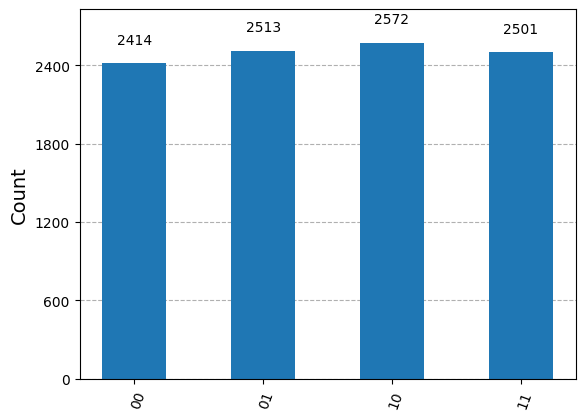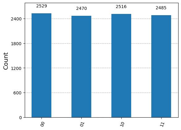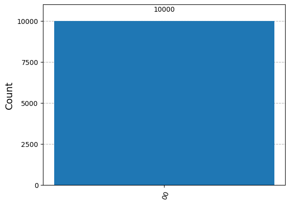 # Importing necessary packages to simulate results from qiskit import transpile from qiskit_aer import AerSimulator backend = AerSimulator() transpiled_qcF = transpile(qcF, backend) job = backend.run(transpiled_qcF, shots=10000) # Shots: Numbers of times the algorithm is run and measured counts = job.result().get_counts() print(counts) from qiskit.visualization import plot_histogram plot_histogram(counts)