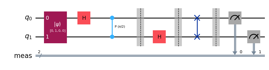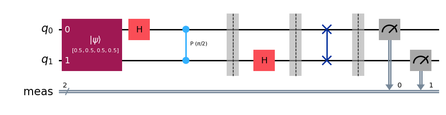 from qiskit import QuantumCircuit import numpy as np def controlled_rotation(qc, control, target, k): """ Adds a controlled rotation gate R_k to the quantum circuit. Parameters: qc (QuantumCircuit): The quantum circuit to which the gate is applied. control (int): The control qubit index. target (int): The target qubit index. k (int): The exponent determining the angle of rotation (2π / 2^k). """ # Calculate the rotation angle (2π divided by 2^k) angle = 2 * np.pi / (2 ** k) # Apply the controlled-phase gate (controlled-R_k) qc.cp(angle, control, target) # Create a 2-qubit quantum circuit qcF = QuantumCircuit(2) qcF.initialize([0.5,0.5,0.5,0.5],[0,1]) (for 1/2(|00⟩+|01⟩+|10⟩+|11⟩=1/2(1,1,1,1)^T)) # Apply a Hadamard gate to qubit 0 to create a superposition qcF.h(0) # Hadamard gate on qubit 0 # Apply controlled rotations with qubit 0 as the target controlled_rotation(qcF, control=1, target=0, k=2) # Controlled R_2 gate qcF.barrier() # Add a barrier to separate different sections of the circuit # Apply a Hadamard gate to qubit 1 qcF.h(1) # Hadamard gate on qubit 1 qcF.barrier() # Barrier after operations on qubit 1 # Swap qubits to reverse the order (commonly done in quantum algorithms like QFT) qcF.swap(0, 1) # Measure all qubits qcF.measure_all() # Print the quantum circuit print(qcF) # Draw the quantum circuit diagram (requires 'matplotlib' to be installed) qcF.draw(output='mpl')Output