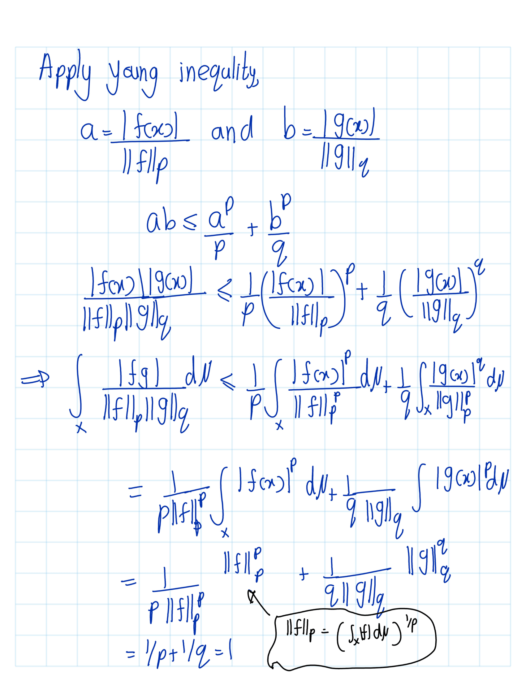 \[ \int_X |f g| \, d\mu \;\le\; \left( \int_X |f|^{p} \, d\mu \right)^{1/p} \left( \int_X |g|^{q} \, d\mu \right)^{1/q}=||f||_p ||f||_q. \]
