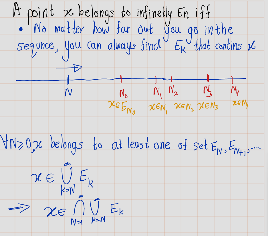 Proof. \[\begin{align*} S&:=\left\{x\in X: x \text{ belongs to infinitly many }E_n\right\}\\ &=\bigcap_{N=1}^\infty \bigcup_{k=N}^\infty E_k \text{ (See latter picture.)} \end{align*}\]