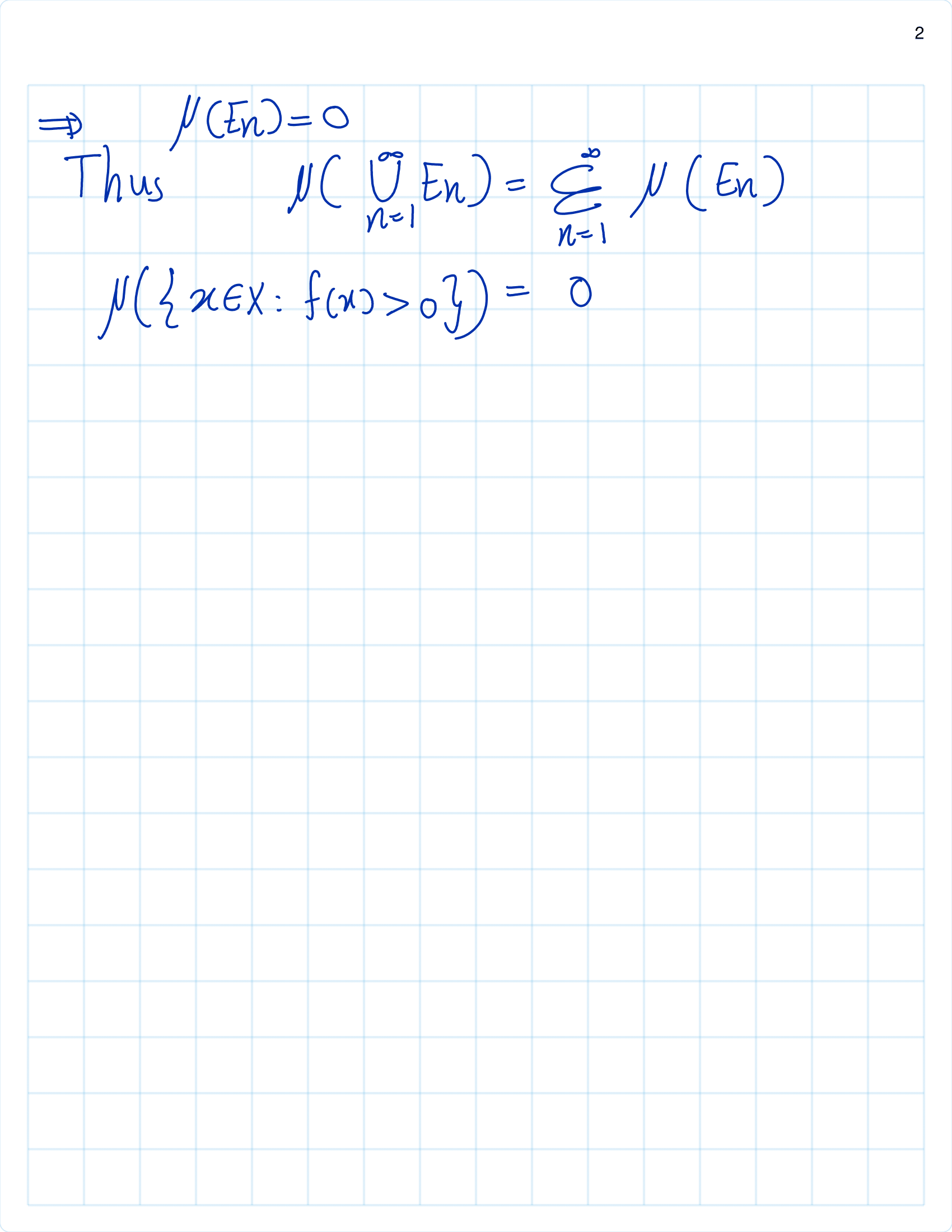Then the set \(E = \bigcap_{n,m} E_{n,m}\) is measurable and satisfies \[ \mu(X \setminus E) = \mu\!\left(X \setminus \bigcap_{n,m=1}^{\infty} E_{n,m}\right) = \mu\!\left(\bigcup_{n,m=1}^{\infty} (X \setminus E_{n,m})\right) \le \sum_{n,m=1}^{\infty} \mu(X \setminus E_{n,m}) = 0. \] and moreover,