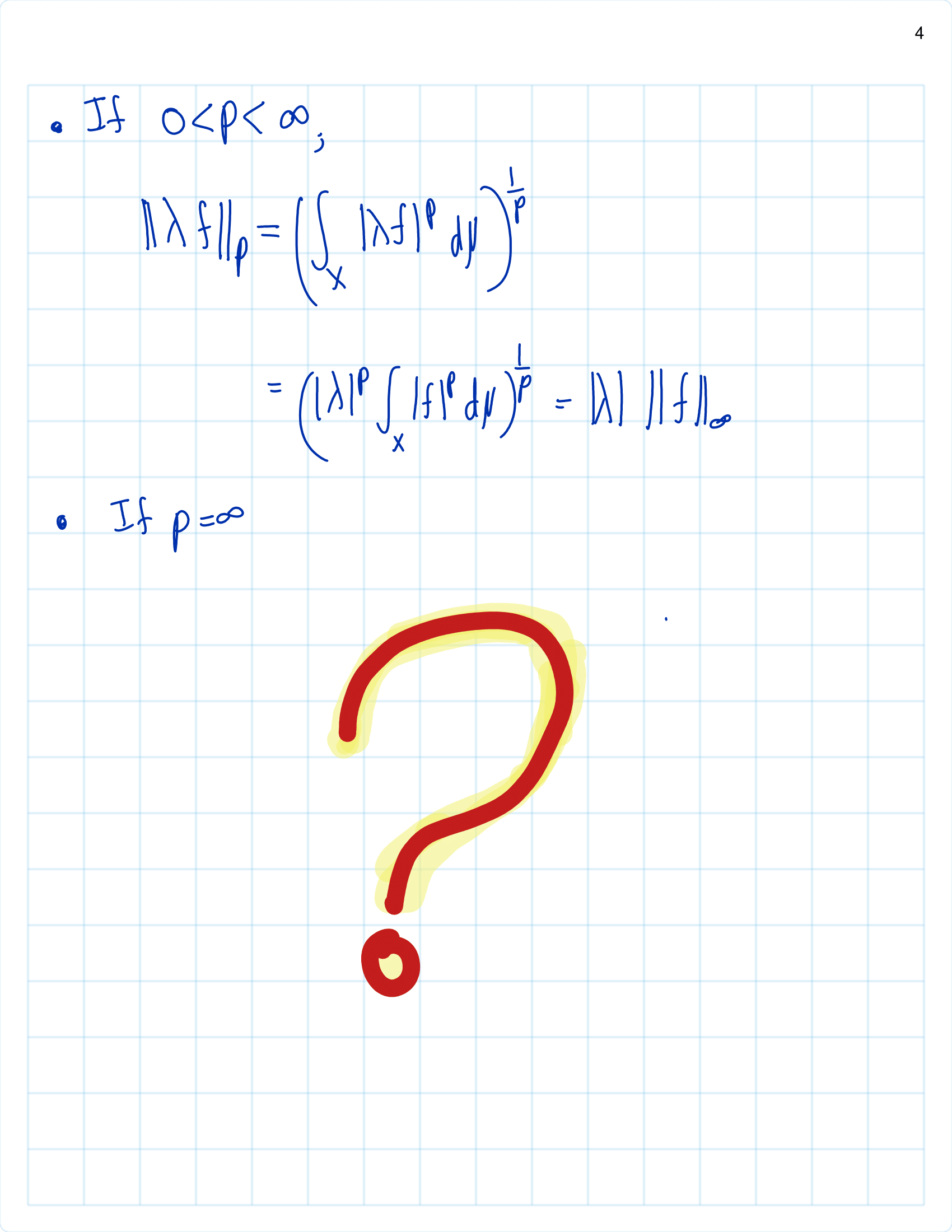 Fact: \(\lambda \in \mathbb{C}, f\in \mathcal{L}^p(X,I,\mu), 0<p\geq\infty,||\lambda f||_p=|\lambda| ||f||_p\).