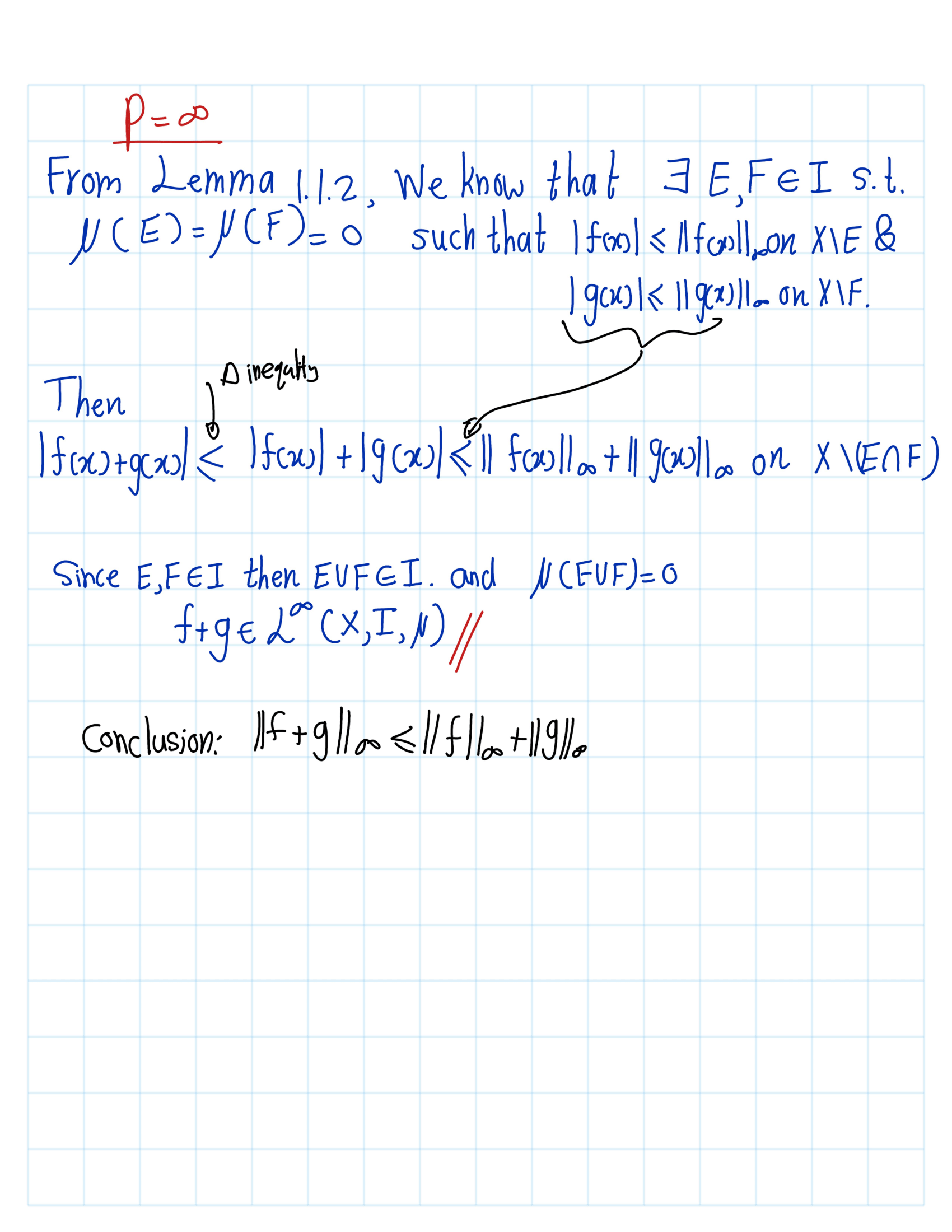 Result : If \(f,g\in \mathcal{L}^P(X,I,\mu)\) then \(f+g\in \mathcal{L}^P(X,I,\mu)\)