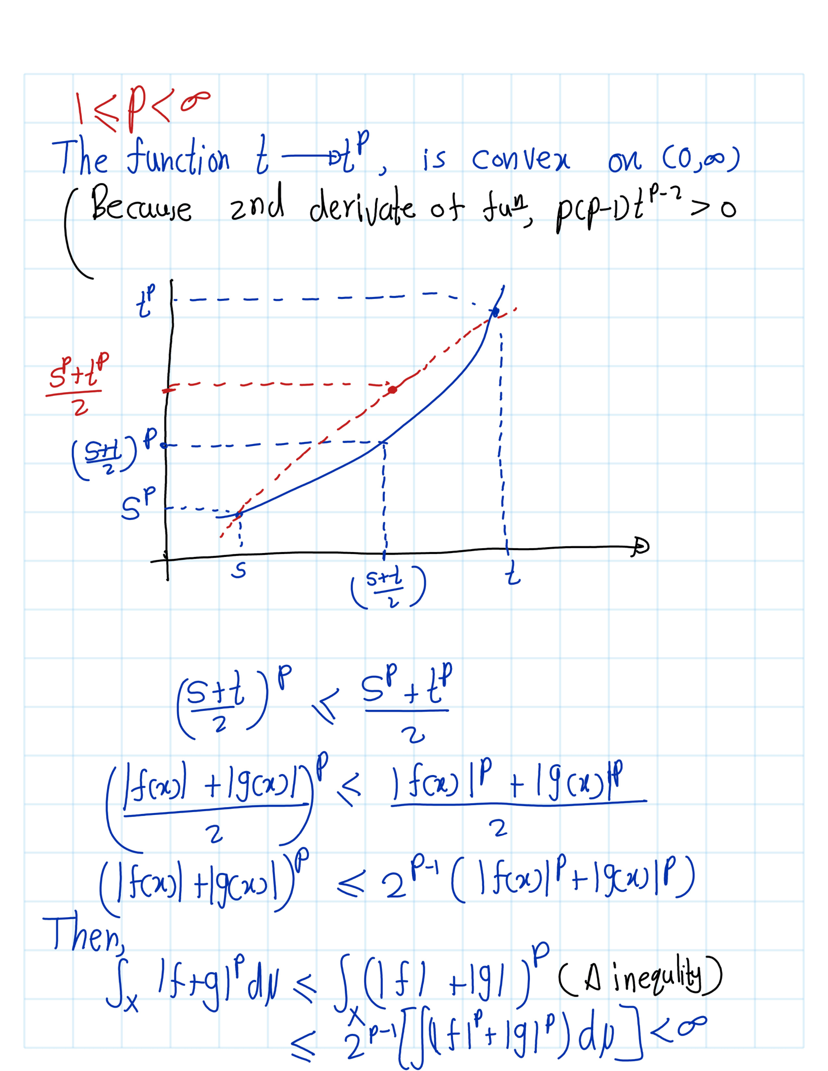Let \(f,g \in \mathcal{L}^p\). Use the standard inequality for \(p \ge 1\): \[ |f+g|^p \le 2^{p-1}\big(|f|^p + |g|^p\big). \] Integrate: \[ \int_X |f+g|^p\,d\mu \le 2^{p-1} \left( \int_X |f|^p\,d\mu + \int_X |g|^p\,d\mu \right) < \infty, \] since both integrals on the right are finite. Hence \(f+g \in \mathcal{L}^p\).