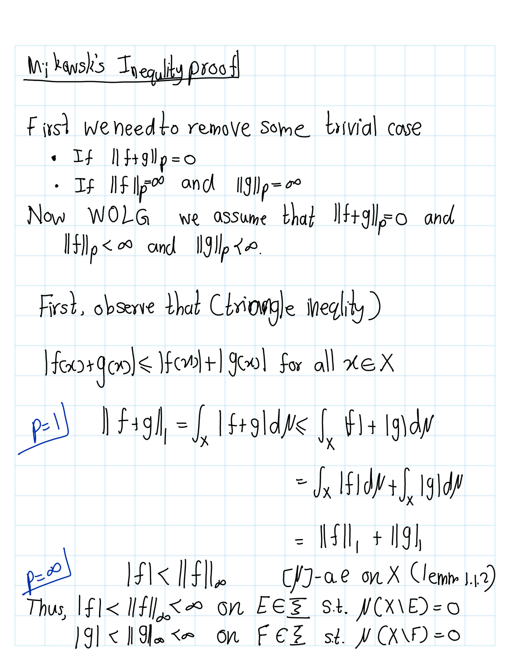 Theorem 1.2 (Minkowski's Inequality) Fix \(1 \le p \le \infty\). Let \(f,g : X \to \mathbb{C}\) be measurable functions. Then \[ \|f + g\|_{p} \le \|f\|_{p} + \|g\|_{p}. \]