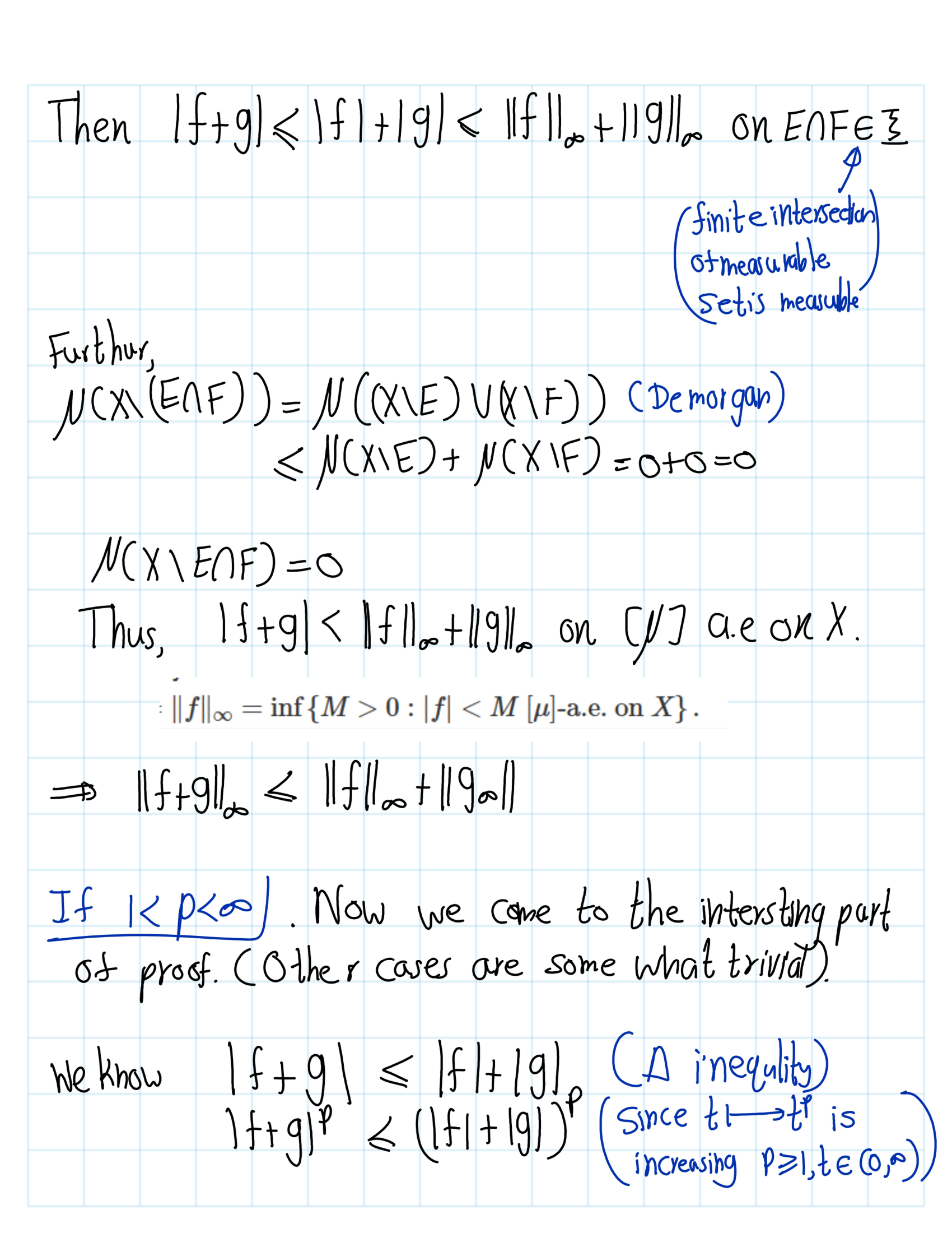 Triangle inequality: For every \(f,g \in L^p(X,\mathcal{T},\mu)\), \[ \|f + g\|_p \le \|f\|_p + \|g\|_p. \]