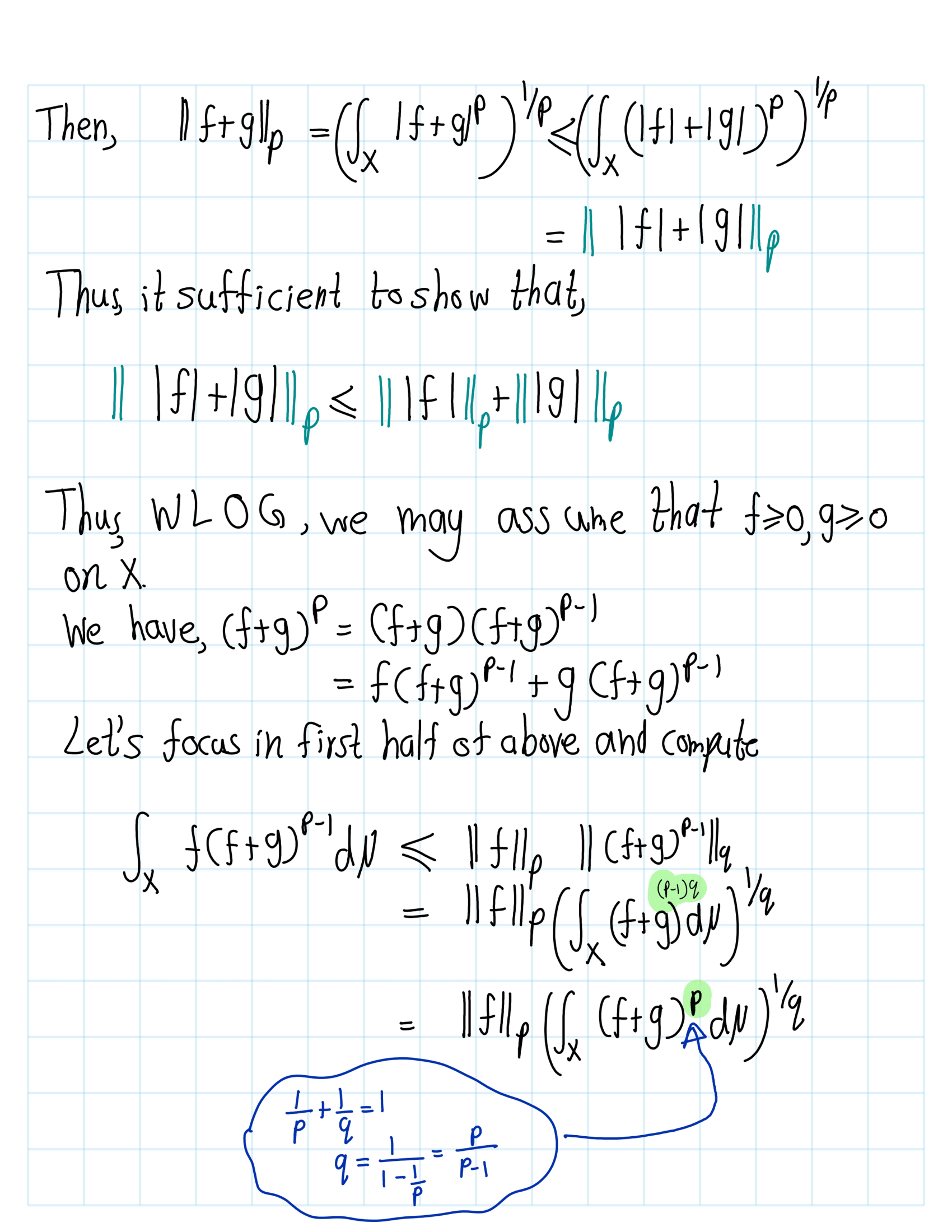\[\begin{align*} \|\lambda f\|_{p} &= |\lambda|\,\|f\|_{p},\\ \|f + g\|_{p} &\le \|f\|_{p} + \|g\|_{p}.\\ & \uparrow\\ &\text{ By Mink}\\ \end{align*}\]